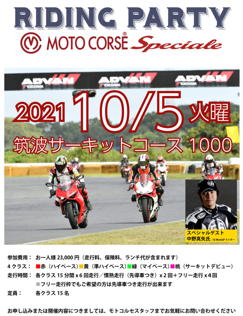ライディングパーティ・モトコルセスペシャル2021 今年も開催させていただきます。 開催日: 2021年10月5日 火曜 開催場所: 筑波サーキット・コース1000 参加費: お一人様23,000円(消費税 […]