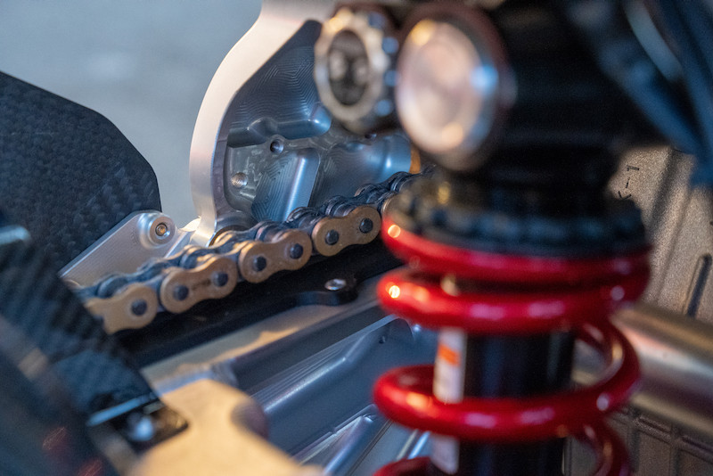 その数々のフレームワークのひとつ、クロームモリブデン鋼トレリスフレーム+アルミニウム削り出しピボットプレートのコンビネーションフレーム。